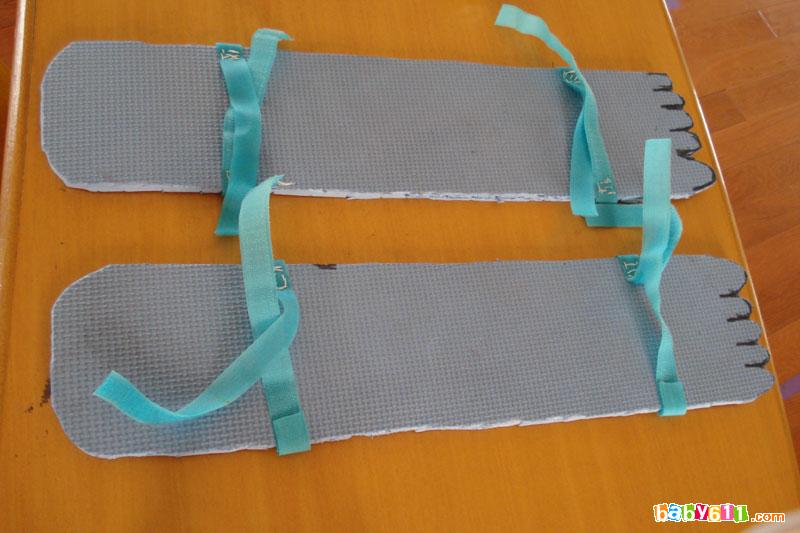 两名幼儿前后站立,将双脚固定在垫板上,协调一致向前走。想想做做,如何始终步调一致,有节奏的走,并且走得快,如“一二、一二”喊口令等。