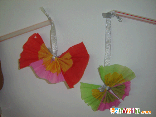 具体玩法:可配合儿歌抖动手中的蝴蝶,吸引幼儿对五彩的蝴蝶的注意,让幼儿的视线随蝴蝶的方位移动。或引幼儿伸手去抓蝴蝶。