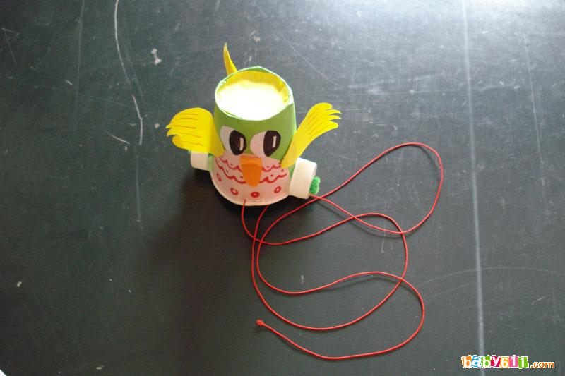 玩法:发展幼儿拖物走及四肢的协调能力。幼儿拉住绳子的一头,拉着小鸭拖车经过各种障碍设置的小路,小山坡等等。也可听老师的信号做听指令拖物走的练习。