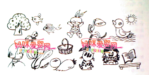 准备:画有树、菜篮、扫帚、白菜、萝卜、老奶奶、小朋友、小兔、小猫、小鸭、画书等单个物体的贴绒卡片。