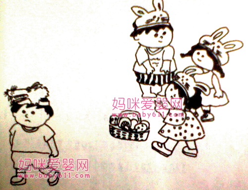 玩法:请一幼儿扮演大灰狼,其余幼儿扮演小白兔。当音乐欢快跳跃时,“小白兔”蹦蹦跳跳地出来采蘑菇;当音乐沉重缓慢时,“大灰狼”出来找零食吃,“小白兔”要赶快躲起来;等“大灰狼”慢慢离去,音乐重新欢快跳跃时,“小白兔”又蹦蹦跳跳地出来采蘑菇了。