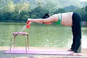 练习要求:站立时吸气,然后呼气时用髋关节带动上半身向前弯曲,手支撑在椅子的靠背上(如果没有血压的问题可以降低身体的角度,手肘支撑在椅子坐垫上),保持身体的平直,感觉背部的伸展,轻缓均匀地呼吸,呼吸的时间由身体的感觉来定,约1分钟。还原时先弯曲双腿,吸气,慢慢抬头,用腿部的力量抬起上身,回到站立姿势。