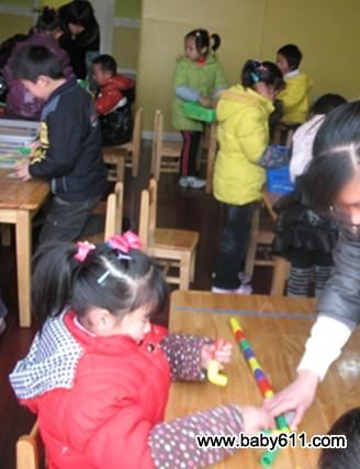 教师:看,这是小朋友们平时常玩的管子玩具,请你们用两分钟的时间赶紧搭一根弯管,比比谁搭得又快又有创意。(幼儿拼搭,教师计时。)