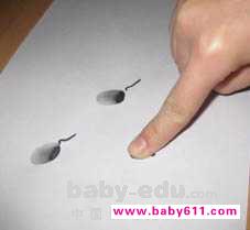 (1) 教师示范:用右手食指的指腹在黑色颜料中轻轻蘸一下,然后把指腹按在纸上再提起,这样小蝌蚪圆圆的身体就出来了。