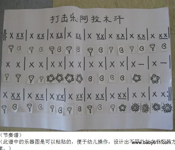 1、小结,我们今天学习了打击乐"阿拉木汗"。与小乐器们玩了游戏。下次老师还会请小朋友来学习担任"小指挥"指挥每种乐器进行表演。还要学习加入"双响筒""刮棒"等乐器来表演,我们将获得更好的音乐感受。
