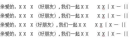个别幼儿表述画面的内容,师引导幼儿观察节奏型,(亲爱的,X X X (好朋友) ,我们一起X X X X | X - || ,尝试填歌词。