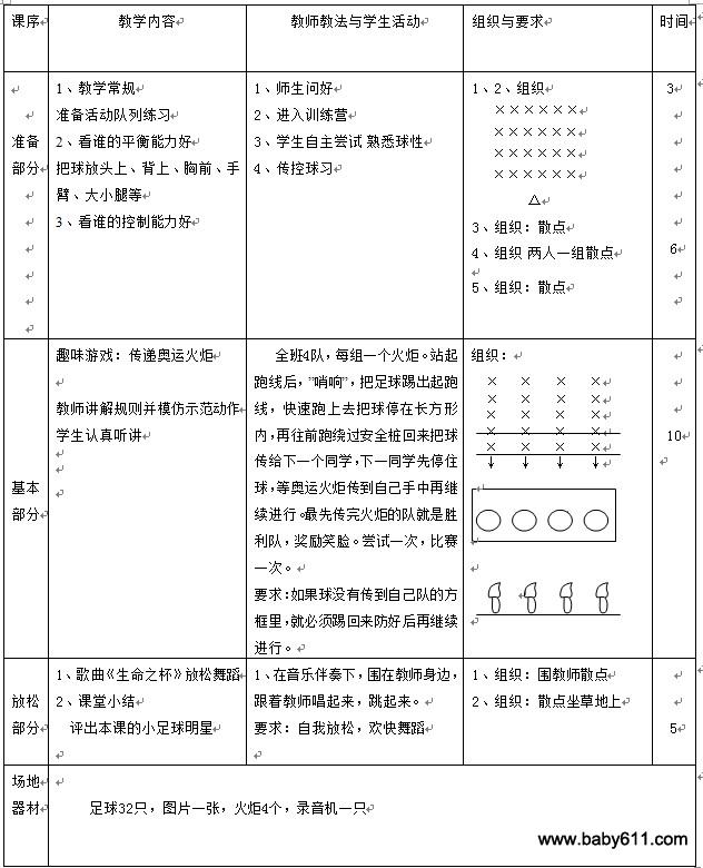 爱上海 教学内容1、足球传控球练习 2、趣味游戏:传递奥运火炬