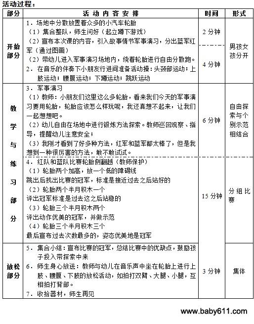 1、利用军事图片让孩子很快的进入军事演习的角色中来2、通过演习让幼儿尝试和探索轮胎侧翻越的方法。