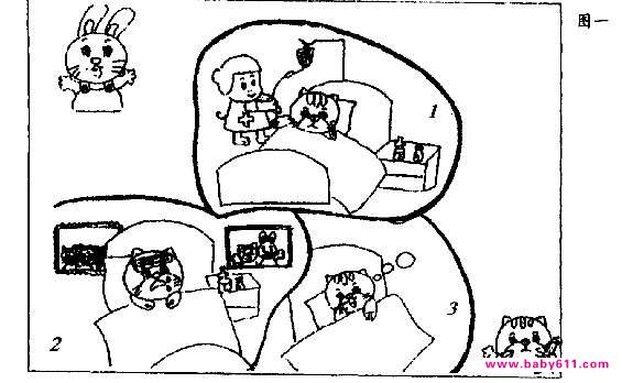 生病,又是孩子们所害怕的事。他们害怕吃药、打针,害怕一个人在家。为了使他们树立一种正确对待病痛的健康心理,为了让他们看到相互关心的乐趣,第三个环节便由此展开,并为第四个环节“关心生病的小朋友”埋下了伏笔。