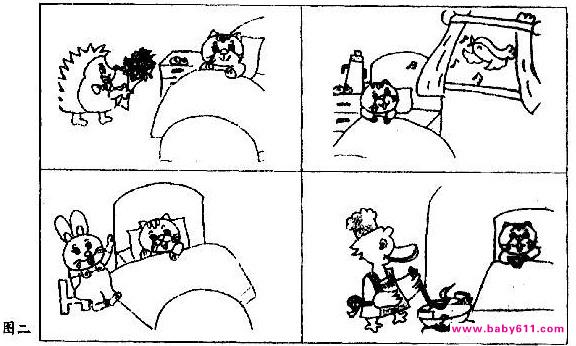 师:有一只小猫生病了,只能整天躲在床上。它想:要是好朋友小兔子能来看看我,那该有多好啊。可是,小兔子家离得挺远的,怎样才能让它知道自己生病了呢?小猫发愁了,怎么办呢?