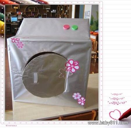 玩具特色:利用废旧纸箱制作,取材方便,废物利用,节约能源。直接在洗衣机的中间抠大半个洞,上面贴几个按纽很简单又形象。幼儿的操作性很强。同时, 幼儿带衣服的积极性也提高了。