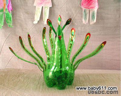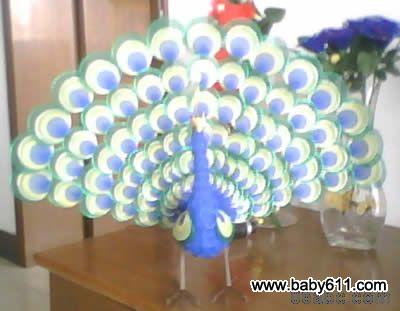幼儿园废旧物手工制作图:塑料瓶孔雀