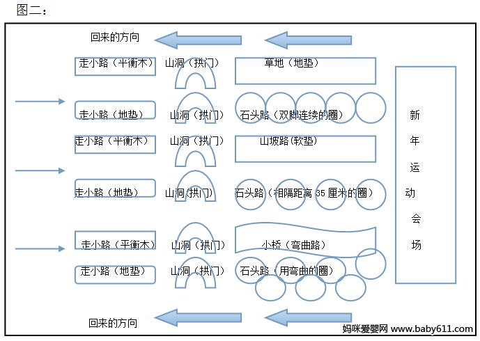 三、游戏《乌龟宝宝去哪》,巩固手膝着地爬的动作要领1.练习爬过去新年运动会会场的三条不同难度的路。