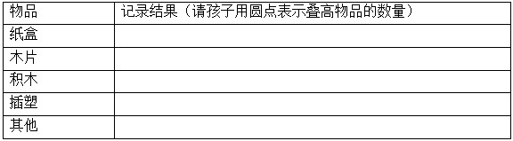 1.通过叠高活动感知纸盒、木片、积木、插塑从低到高的变化。