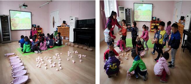 活动延伸:请幼儿捡不能数量的蛋宝宝,并孵出相应数量的小鸡。