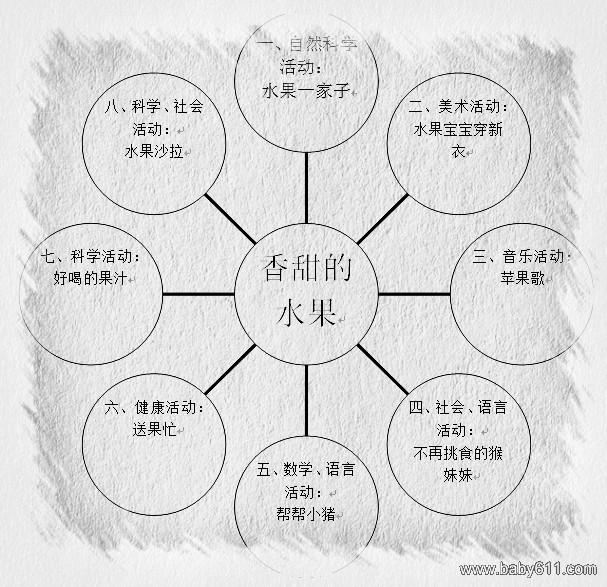 水果家族以其色彩斑斓、形态各异、味道鲜美、营养丰富的特点深受人们的青睐,对于幼儿来说更是他们健康成长的物质来源。随着秋天的到来,各类水果都成熟了:香香的苹果、甜甜的梨儿、红红的柿子、紫盈盈的葡萄,还有那咧着嘴儿的石榴......这些就存在于幼儿的生活中,并为幼儿所熟悉。然而这种熟悉仅仅是一种初级的、模糊的感知,如何让这种混沌、单一的知觉变得明晰、丰富,就是主题活动"香甜的水果"要解决的主要问题。