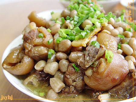 材料:猪脚100克,花生20克,香菜末少许,豆苗少许