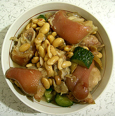 材料:猪脚120克,黄豆30克,香菜少许 调味料:生抽3小匙,白糖1小匙,八角(大料)1粒 做法: 猪脚去毛洗净,用沸水川烫过,黄豆泡水约5小时备用。 将处理好的猪脚和花生,连同调味料及水一起炖煮约1个半小时,至猪脚与黄豆均熟烂即可。 盛盘后放些香菜更添风味。