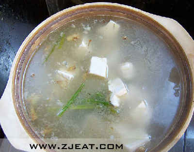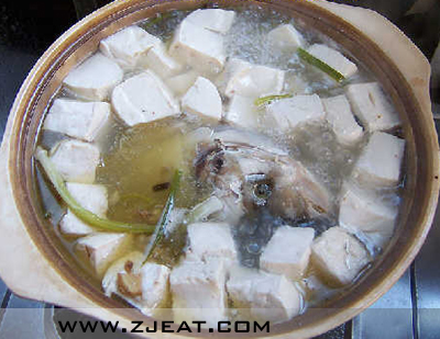 头捞出,放入沙锅内,再将豆腐、汤水一起倒入沙锅内,放入大蒜,小火烧10分钟;然后加入味精轻轻拌匀即成。