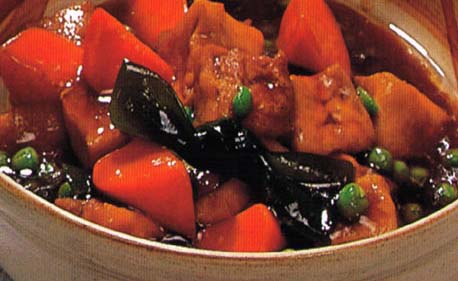 爱上海 2、锅上火放油烧热,倒入炸豆腐、海带结、豌豆、胡萝卜块炒匀,加鲜汤、美极鲜酱油、白糖、绍酒、精盐,小火煮30分钟,加入味精,湿淀粉勾芡即成。