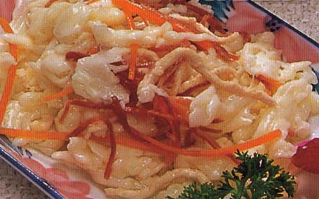 原材料:鸡脯肉200克,鸡蛋清4个,胡萝卜丝、火腿丝、精盐、绍酒、味精、鲜汤、湿淀粉、植物油各适量。