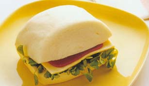 2 鲜奶馒头蒸热后夹入火腿片、乳酪片及豌豆苗即可食用。