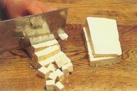 1、豆腐用开水烫一下,切成小方丁,放入大碗中。