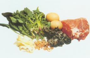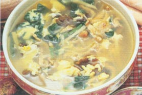 用料:瘦猪肉50克、鸡蛋1个、菠菜50克、水发木耳5克、水发笋片25克、水发海米10克、酱油、精盐、味精、香油、高汤各适量。