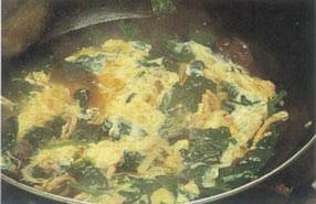 4、炒勺内放入高汤烧沸,放入肉丝、海米、木耳、笋丝、菠菜 ,加精盐、酱油调味,汤沸后把确定内的蛋液甩入汤内,放入味精、香油即可。