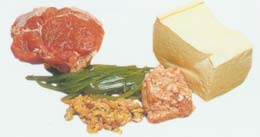 用料:豆腐250克、肉末50克、海米15克、海带丝200克、瘦五花猪肉250克、酱油50克、精盐、味精、淀粉、葱、姜、花生油各适量。