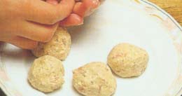1、豆腐捣烂、加肉末、海米、葱末、姜末、精盐、味精、淀粉搅动匀