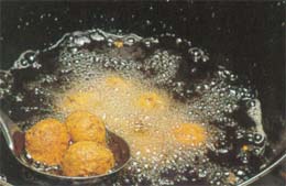 3、把花生油倒入锅内,烧至五成熟时,放入大丸子,炸好。