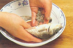 2、鲫鱼去鳞及内脏,洗净,抹干,拌匀调味料,涂在鱼身上。