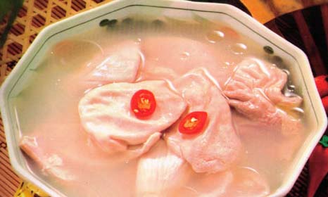 3、把猪肚放入煲中煲约1小时,然后取出糯米,将猪肚切成小块,放入原汤中继续煲,至肉烂熟后,加入调味料即可。