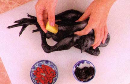 1、将乌鸡宰杀,煺净毛,开膛,去内脏,洗净;将大枣、枸杞子洗净;生姜洗净去皮,拍破。