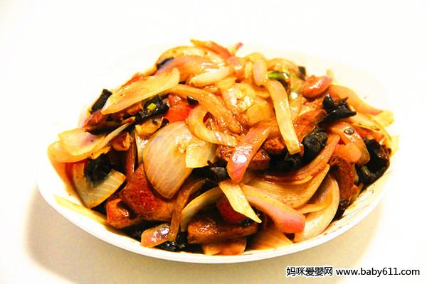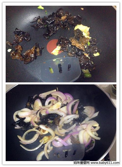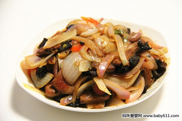 爱上海 3)放入黑木耳翻炒3分钟,加入洋葱快速爆炒,加盐和少量糖调味后放入猪肝和红椒,炒匀即可。
