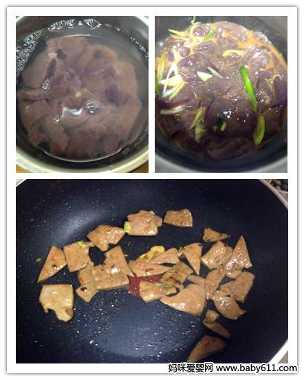 2)猪肝洗净,切薄片,多次换水、浸泡,洗净所有血水,用生抽、淀粉、葱姜腌制后爆炒盛出。