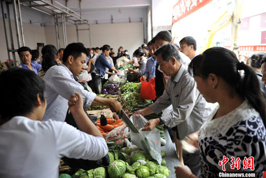 8月14日,甘肃舟曲灾区县政府办公大楼前的南街开设了一家灾区急需商品临时市场,受灾群众在这里可以买到10余种物美价廉的蔬菜水果。