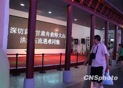 国务院将8月15日定为对甘肃舟曲特大山洪泥石流遇难同胞的“全国哀悼日”。图为14日晚,甘肃馆打出“深切哀悼甘肃舟曲特大山洪泥石流遇难同胞”的黑幕大屏,为明日的哀悼日做准备。 中新社发 郭虹 摄
