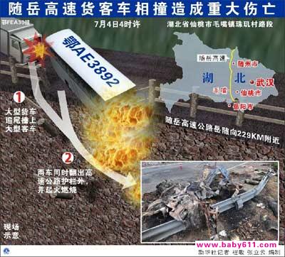 两车均翻出护栏并起火燃烧据湖北省交警总队介绍,4日凌晨3点50分左右,一辆车号为鄂AE3892的大型客车,在随岳高速公路岳随向229KM附近停车时,被后方一辆车号为“鄂FEA30挂”的半挂式大型货车追尾相撞,造成两车同时翻出高速公路护栏外,并起火燃烧,致使23人死亡。由于现场死者遗体不易辨认,此前,事故造成的死亡人数一度统计为26人。