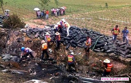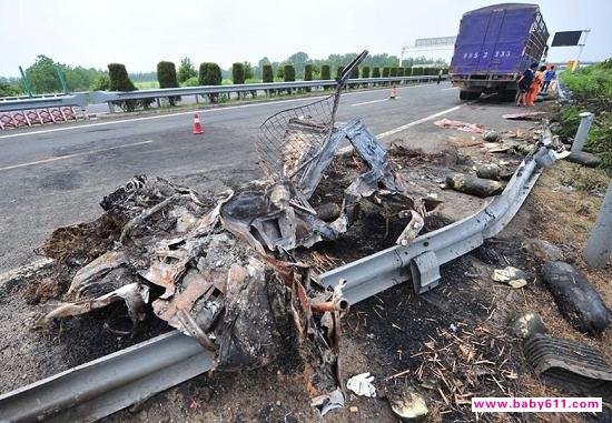 记者在现场看到,近60米长的高速公路护栏被全部冲断,路基下面撞断的一段护栏几乎是被扭成麻花。路旁直径30厘米左右的空心高杆高速路标柱被齐根撞断,倒在路基下面。两台车辆的主体残骸已被拖走,现场只剩下几堆被烧成铁架的座椅。货车满载的冬瓜已散落的到处都是。公路路面上还布满了黑色的油迹,散发的柴油气味依然浓重。
