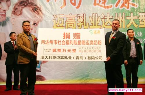 图为澳大利亚迈高乳业国际部经理斯图尔特·戴维先生向达州市社会福利院捐赠价值20万元奶粉