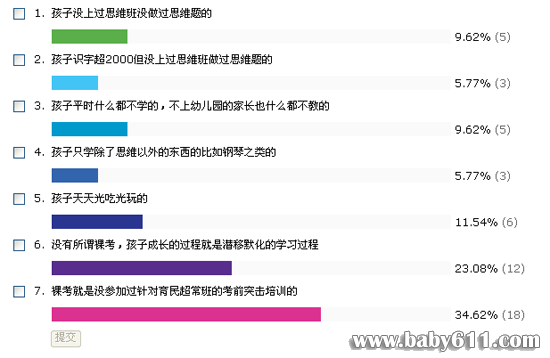 爱上海 通过上述e度论坛《什么是裸考?》投票结果,我们可以看出有高达34.62%的家长选择了第七项裸考就是没参加过育民超常班的考前突击培训的。此外,有大约23.09%的家长选择了第六项没有所谓的裸考,孩子成长的过程就是潜移默化的学习过程。由此可以看出家长对于“裸考”的看法还是十分理智的。