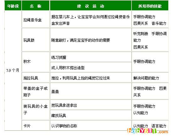 在这一阶段,手眼协调动作发生了,宝宝可以准确地把手伸向玩具,不像前一阶段手要在玩具周围转几圈才能拿到。宝宝可以做出一些简单而有效的动作:坐在桌边时,宝宝喜欢用手抓挠桌面,够桌上的玩具;宝宝喜欢撕纸,会摇动和敲打玩具,记住不同的玩具有不同的玩法和功能;玩具掉了,宝宝会顺着掉的方向去看;并且两只手可以同时抓住两个玩具。