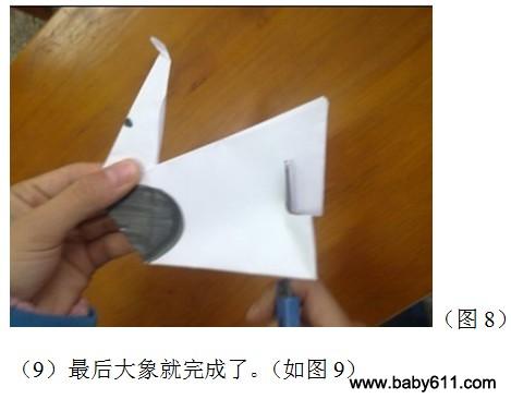 师:好了,老师的大象折完了。现在该小朋友们折大象了,小朋友们就按照老师刚才的步骤一步一步的折。