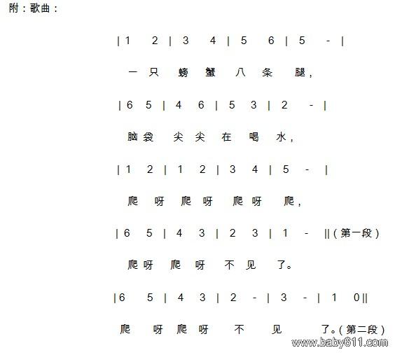 一只螃蟹八条腿,(一字一拍,四指曲张四次)脑袋尖尖在喝水,(两字一拍,两拇指"点"头四次)爬呀爬呀爬呀爬,(两字一拍,双手向左爬四次)爬呀爬呀不见了。(第一段音乐两字一拍,双手向右爬两次,然后双手藏在背后。第二段音乐两字一拍,双手向右爬两次,不见-双手向前一摊,了-立即把手藏在背后。)双手靠拢:两拇指做脑袋,两手的四指做螃蟹的八条腿。