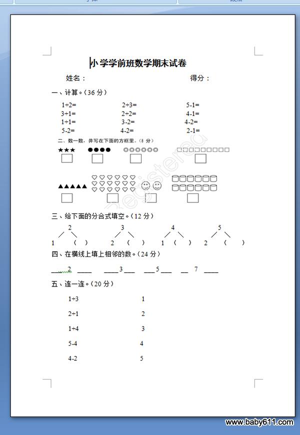 学前班数学期末试卷 测试题