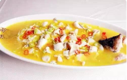 3、锅放油烧至六成热,锅内放入野山椒小火炒香,加入酸汤、宽粉、盐、鱼露、香醋、白糖、鸡精调好味道,大火烧开,淋在蒸好的鱼上,撒上小米椒即可、上菜时在盘底点上酒精炉,既能使宽粉软滑,能增加气氛。